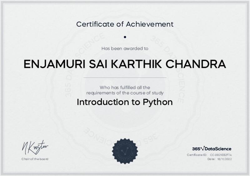 This user has been awarded the Introduction to Python Certificate for successfully completing the course exam. Holding this certificate demonstrates their proficiency on the topic and signifies they are qualified to apply their newly acquired expertise in the fields of data analytics and data science.