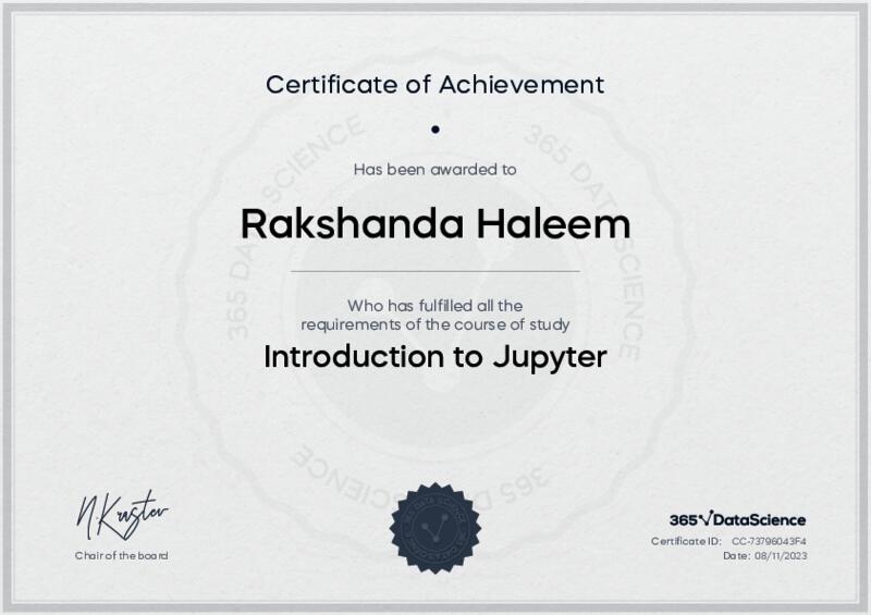 This user has been awarded the Introduction to Jupyter Certificate for successfully completing the course exam. Holding this certificate demonstrates their proficiency on the topic and signifies they are qualified to apply their newly acquired expertise in the fields of data analytics and data science.
