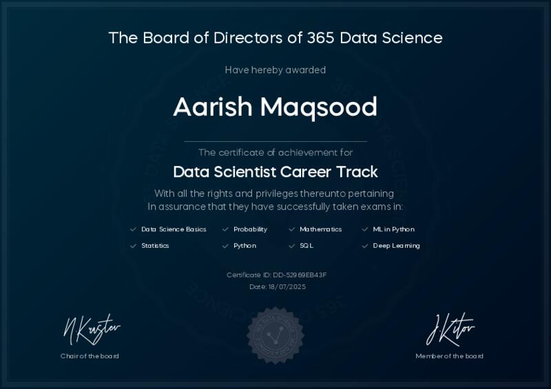 This user has been awarded the Data Scientist Career Track Certificate for successfully completing all courses and assessments. This certificate confirms their technical expertise and professional credibility to work as a data scientist.
