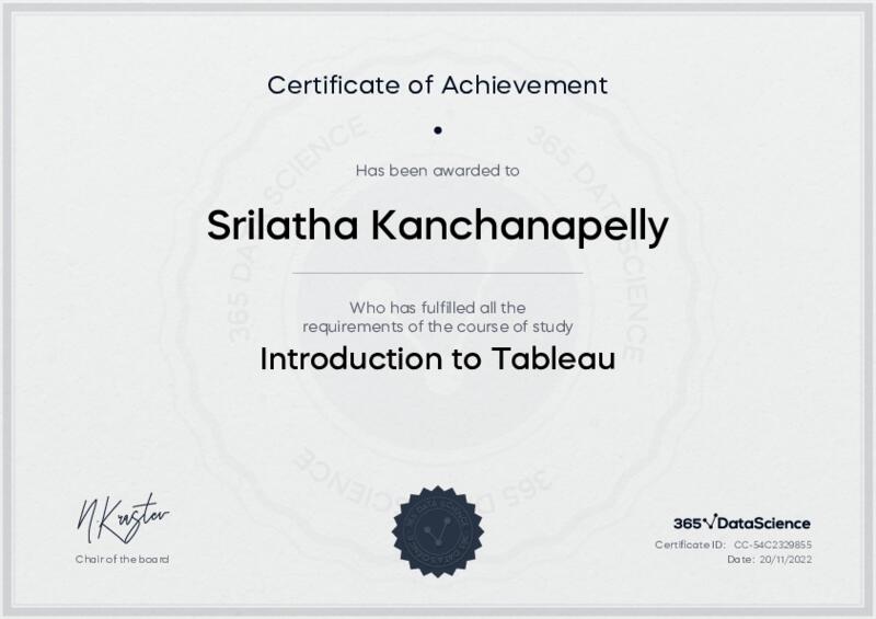 This user has been awarded the Introduction to Tableau Certificate for successfully completing the course exam. Holding this certificate demonstrates their proficiency on the topic and signifies they are qualified to apply their newly acquired expertise in the fields of data analytics and data science.