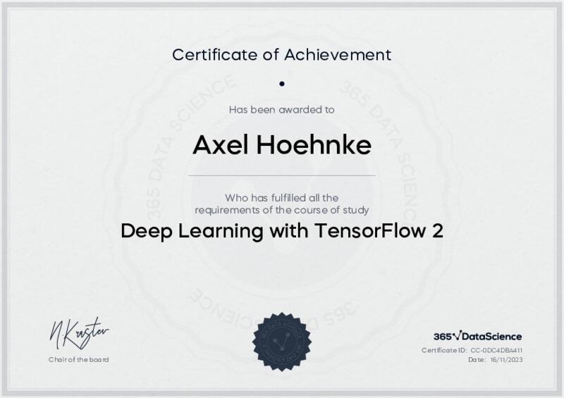 This user has been awarded the Deep Learning with TensorFlow 2 Certificate for successfully completing the course exam. Holding this certificate demonstrates their proficiency on the topic and signifies they are qualified to apply their newly acquired expertise in the fields of data analytics and data science.