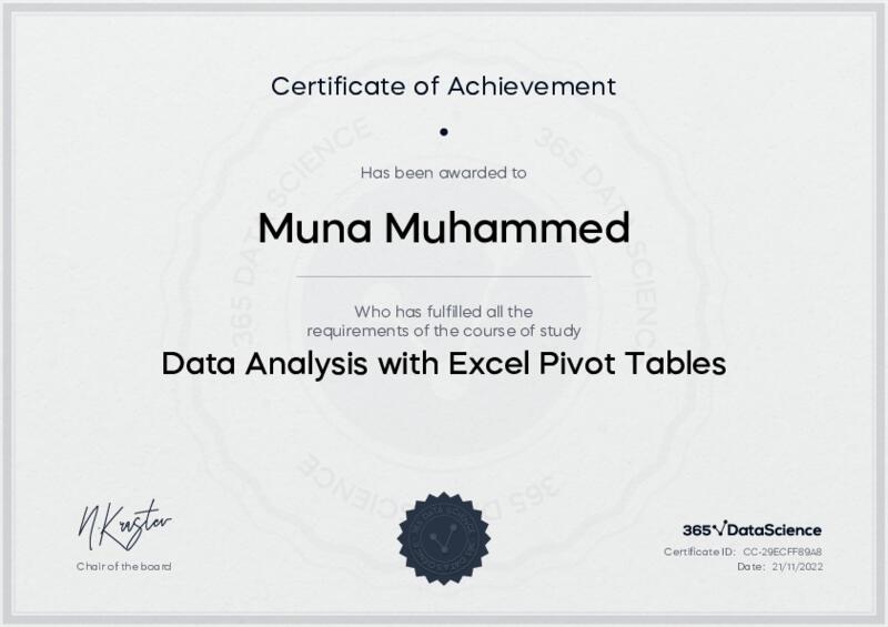 This user has been awarded the Data Analysis with Excel Pivot Tables Certificate for successfully completing the course exam. Holding this certificate demonstrates their proficiency on the topic and signifies they are qualified to apply their newly acquired expertise in the fields of data analytics and data science.