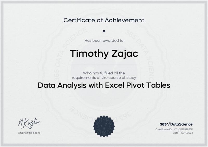 This user has been awarded the Data Analysis with Excel Pivot Tables Certificate for successfully completing the course exam. Holding this certificate demonstrates their proficiency on the topic and signifies they are qualified to apply their newly acquired expertise in the fields of data analytics and data science.