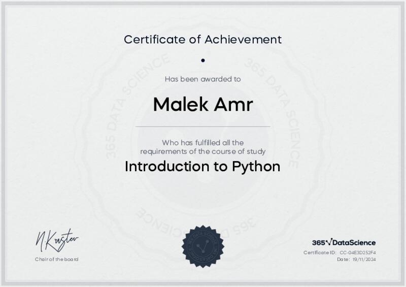 This user has been awarded the Introduction to Python Certificate for successfully completing the course exam. Holding this certificate demonstrates their proficiency on the topic and signifies they are qualified to apply their newly acquired expertise in the fields of data analytics and data science.