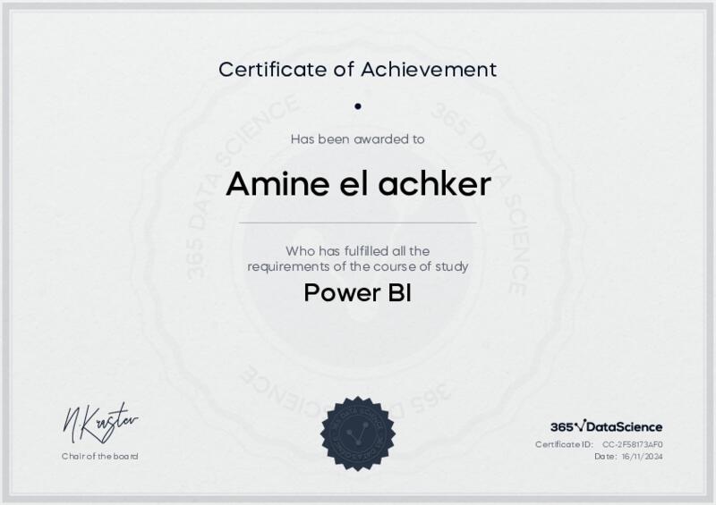 This user has been awarded the Power BI Certificate for successfully completing the course exam. Holding this certificate demonstrates their proficiency on the topic and signifies they are qualified to apply their newly acquired expertise in the fields of data analytics and data science.