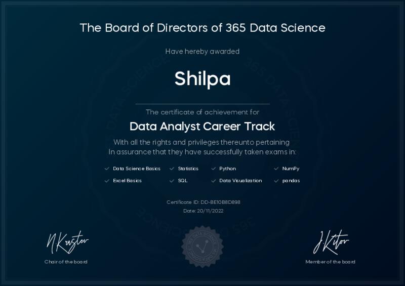 This user has been awarded the Data Analyst Career Track Certificate for successfully completing all courses and assessments. This certificate confirms their technical expertise and professional credibility to work as a data analyst.