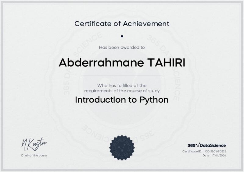 This user has been awarded the Introduction to Python Certificate for successfully completing the course exam. Holding this certificate demonstrates their proficiency on the topic and signifies they are qualified to apply their newly acquired expertise in the fields of data analytics and data science.