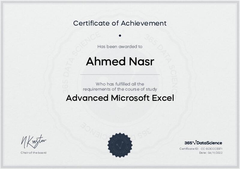This user has been awarded the Advanced Microsoft Excel Certificate for successfully completing the course exam. Holding this certificate demonstrates their proficiency on the topic and signifies they are qualified to apply their newly acquired expertise in the fields of data analytics and data science.