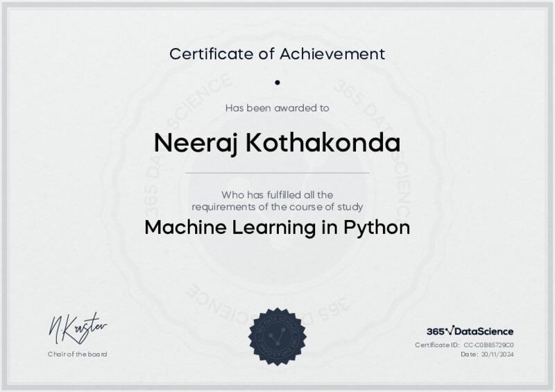 This user has been awarded the Machine Learning in Python Certificate for successfully completing the course exam. Holding this certificate demonstrates their proficiency on the topic and signifies they are qualified to apply their newly acquired expertise in the fields of data analytics and data science.