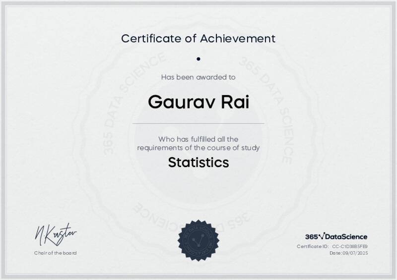 This user has been awarded the Statistics Certificate for successfully completing the course exam. Holding this certificate demonstrates their proficiency on the topic and signifies they are qualified to apply their newly acquired expertise in the fields of data analytics and data science.
