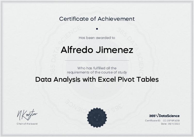 This user has been awarded the Data Analysis with Excel Pivot Tables Certificate for successfully completing the course exam. Holding this certificate demonstrates their proficiency on the topic and signifies they are qualified to apply their newly acquired expertise in the fields of data analytics and data science.