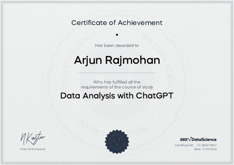 This user has been awarded the Data Analysis with ChatGPT Certificate for successfully completing the course exam. Holding this certificate demonstrates their proficiency on the topic and signifies they are qualified to apply their newly acquired expertise in the fields of data analytics and data science.