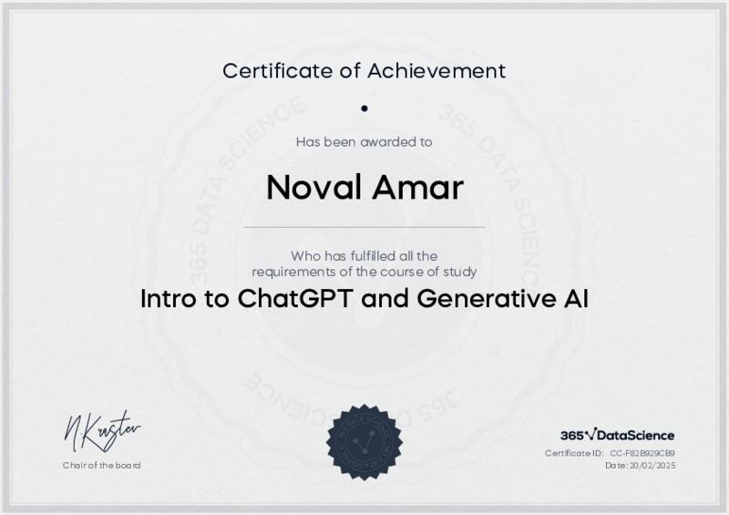 This user has been awarded the Intro to ChatGPT and Generative AI Certificate for successfully completing the course exam. Holding this certificate demonstrates their proficiency on the topic and signifies they are qualified to apply their newly acquired expertise in the fields of data analytics and data science.