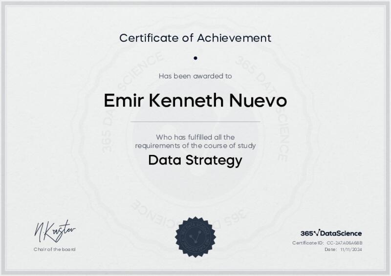 This user has been awarded the Data Strategy Certificate for successfully completing the course exam. Holding this certificate demonstrates their proficiency on the topic and signifies they are qualified to apply their newly acquired expertise in the fields of data analytics and data science.