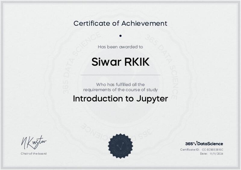 This user has been awarded the Introduction to Jupyter Certificate for successfully completing the course exam. Holding this certificate demonstrates their proficiency on the topic and signifies they are qualified to apply their newly acquired expertise in the fields of data analytics and data science.