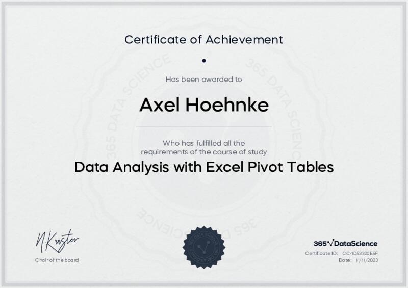 This user has been awarded the Data Analysis with Excel Pivot Tables Certificate for successfully completing the course exam. Holding this certificate demonstrates their proficiency on the topic and signifies they are qualified to apply their newly acquired expertise in the fields of data analytics and data science.