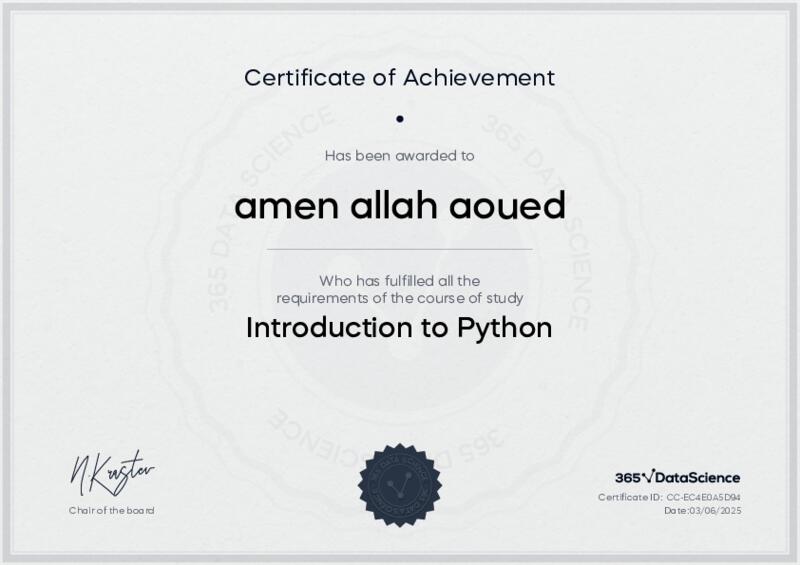 This user has been awarded the Introduction to Python Certificate for successfully completing the course exam. Holding this certificate demonstrates their proficiency on the topic and signifies they are qualified to apply their newly acquired expertise in the fields of data analytics and data science.