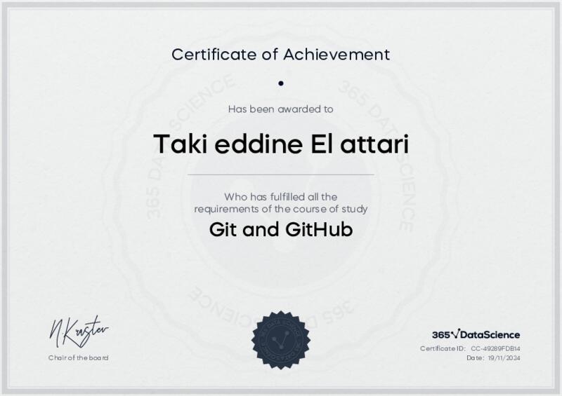 This user has been awarded the Git and GitHub Certificate for successfully completing the course exam. Holding this certificate demonstrates their proficiency on the topic and signifies they are qualified to apply their newly acquired expertise in the fields of data analytics and data science.