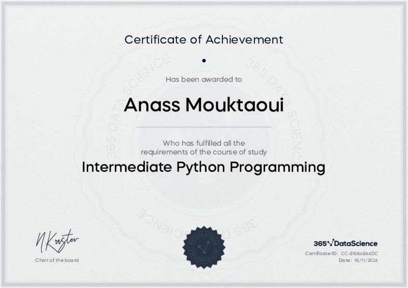This user has been awarded the Intermediate Python Programming Certificate for successfully completing the course exam. Holding this certificate demonstrates their proficiency on the topic and signifies they are qualified to apply their newly acquired expertise in the fields of data analytics and data science.