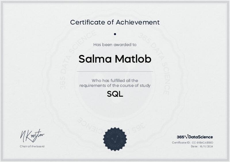 This user has been awarded the SQL Certificate for successfully completing the course exam. Holding this certificate demonstrates their proficiency on the topic and signifies they are qualified to apply their newly acquired expertise in the fields of data analytics and data science.