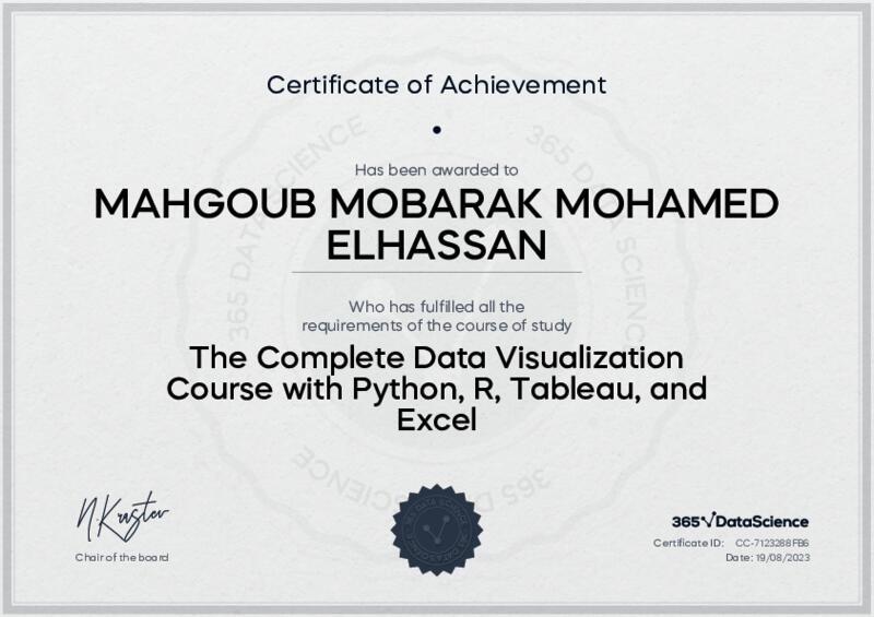 This user has been awarded the The Complete Data Visualization Course with Python, R, Tableau, and Excel Certificate for successfully completing the course exam. Holding this certificate demonstrates their proficiency on the topic and signifies they are qualified to apply their newly acquired expertise in the fields of data analytics and data science.