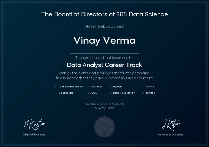 This user has been awarded the Data Analyst Career Track Certificate for successfully completing all courses and assessments. This certificate confirms their technical expertise and professional credibility to work as a data analyst.