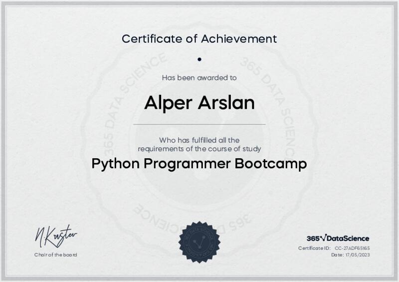This user has been awarded the Python Programmer Bootcamp Certificate for successfully completing the course exam. Holding this certificate demonstrates their proficiency on the topic and signifies they are qualified to apply their newly acquired expertise in the fields of data analytics and data science.