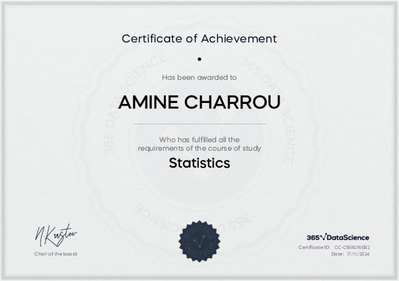 This user has been awarded the Statistics Certificate for successfully completing the course exam. Holding this certificate demonstrates their proficiency on the topic and signifies they are qualified to apply their newly acquired expertise in the fields of data analytics and data science.