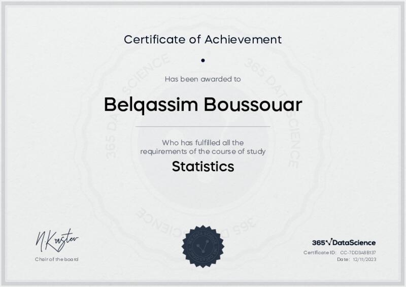 This user has been awarded the Statistics Certificate for successfully completing the course exam. Holding this certificate demonstrates their proficiency on the topic and signifies they are qualified to apply their newly acquired expertise in the fields of data analytics and data science.