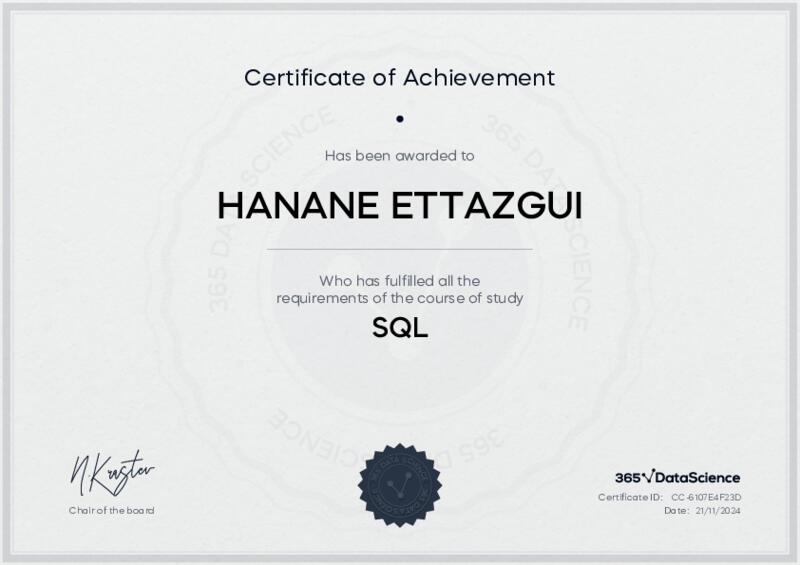 This user has been awarded the SQL Certificate for successfully completing the course exam. Holding this certificate demonstrates their proficiency on the topic and signifies they are qualified to apply their newly acquired expertise in the fields of data analytics and data science.