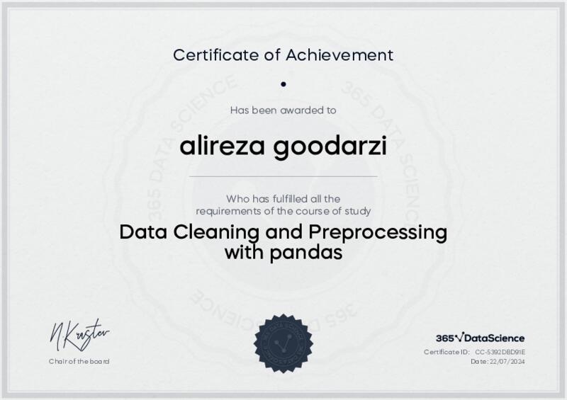 This user has been awarded the Data Cleaning and Preprocessing with pandas Certificate for successfully completing the course exam. Holding this certificate demonstrates their proficiency on the topic and signifies they are qualified to apply their newly acquired expertise in the fields of data analytics and data science.