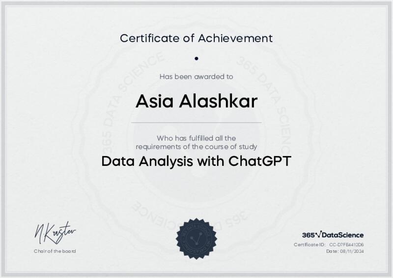 This user has been awarded the Data Analysis with ChatGPT Certificate for successfully completing the course exam. Holding this certificate demonstrates their proficiency on the topic and signifies they are qualified to apply their newly acquired expertise in the fields of data analytics and data science.