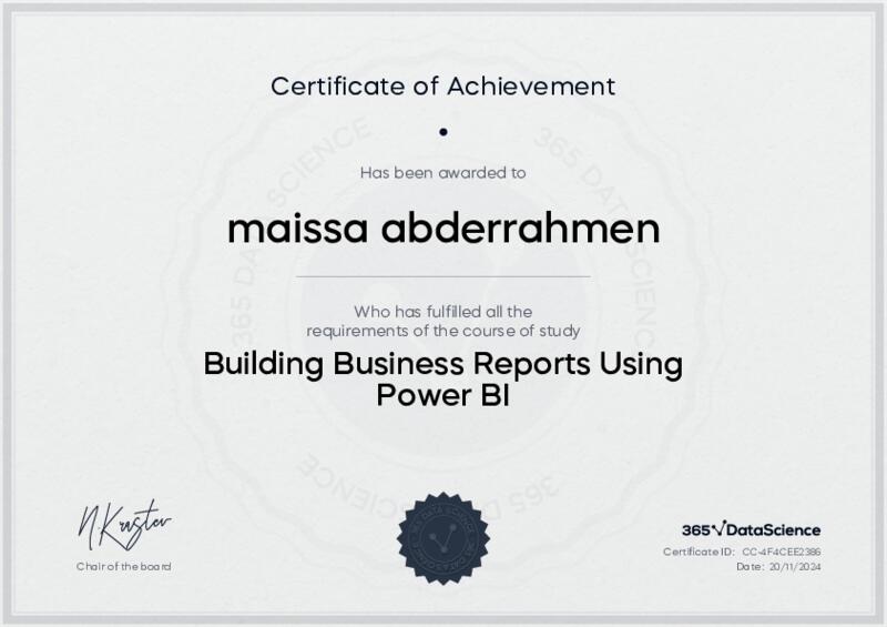 This user has been awarded the Building Business Reports Using Power BI Certificate for successfully completing the course exam. Holding this certificate demonstrates their proficiency on the topic and signifies they are qualified to apply their newly acquired expertise in the fields of data analytics and data science.