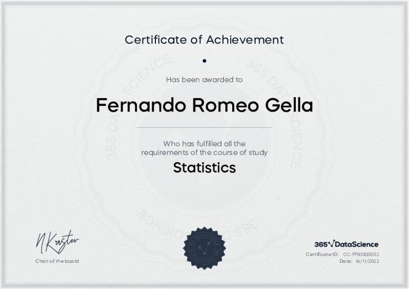This user has been awarded the Statistics Certificate for successfully completing the course exam. Holding this certificate demonstrates their proficiency on the topic and signifies they are qualified to apply their newly acquired expertise in the fields of data analytics and data science.