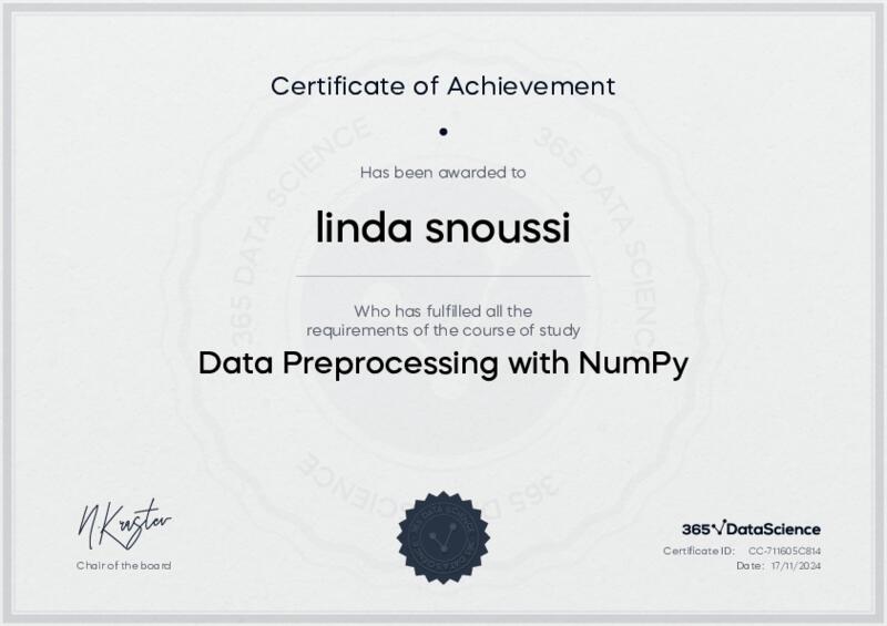 This user has been awarded the Data Preprocessing with NumPy Certificate for successfully completing the course exam. Holding this certificate demonstrates their proficiency on the topic and signifies they are qualified to apply their newly acquired expertise in the fields of data analytics and data science.