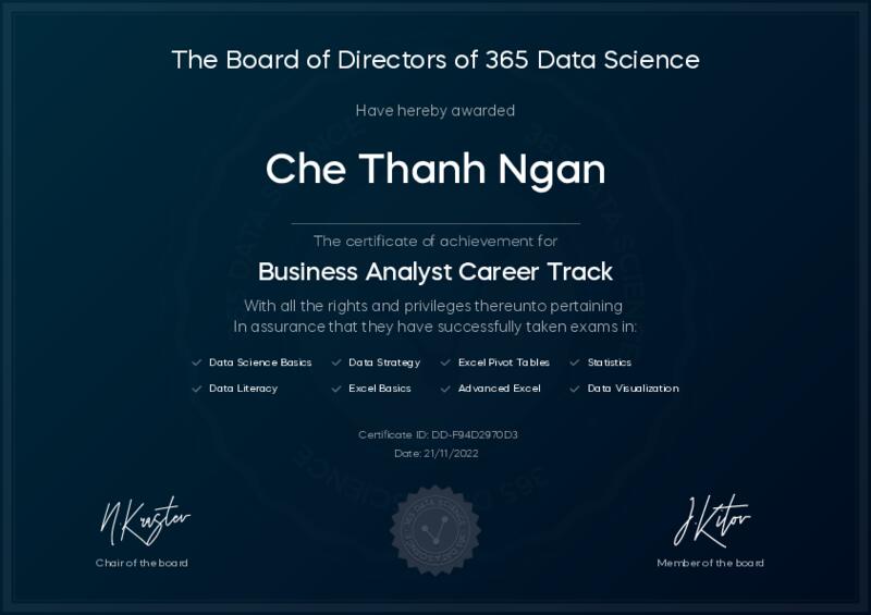 This user has been awarded the Business Analyst Career Track Certificate for successfully completing all courses and assessments. This certificate confirms their technical expertise and professional credibility to work as a business analyst.