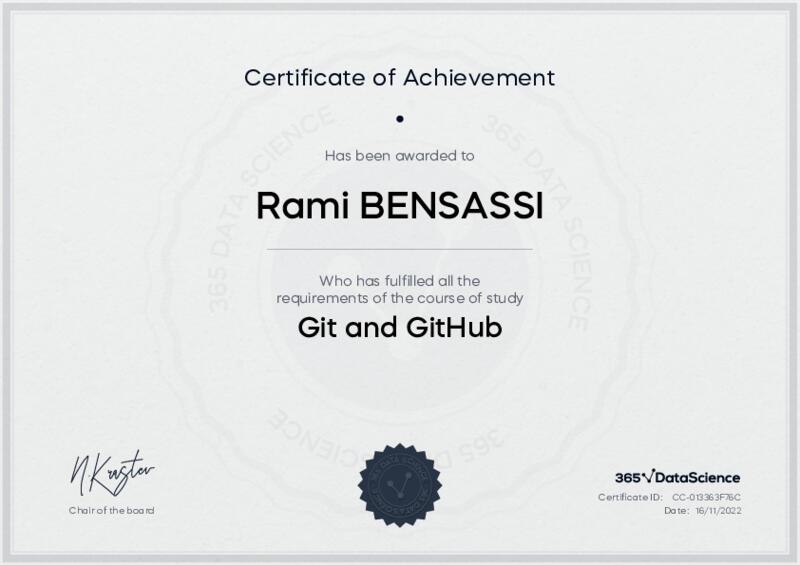 This user has been awarded the Git and GitHub Certificate for successfully completing the course exam. Holding this certificate demonstrates their proficiency on the topic and signifies they are qualified to apply their newly acquired expertise in the fields of data analytics and data science.