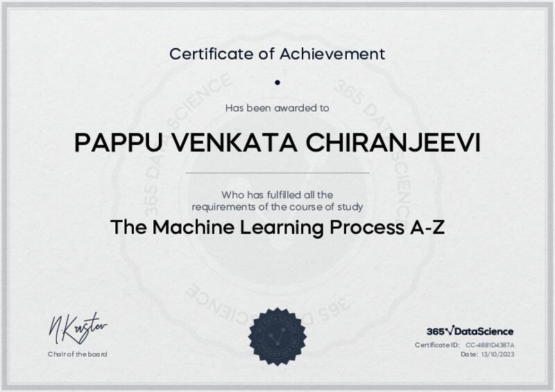 This user has been awarded the The Machine Learning Process A-Z Certificate for successfully completing the course exam. Holding this certificate demonstrates their proficiency on the topic and signifies they are qualified to apply their newly acquired expertise in the fields of data analytics and data science.