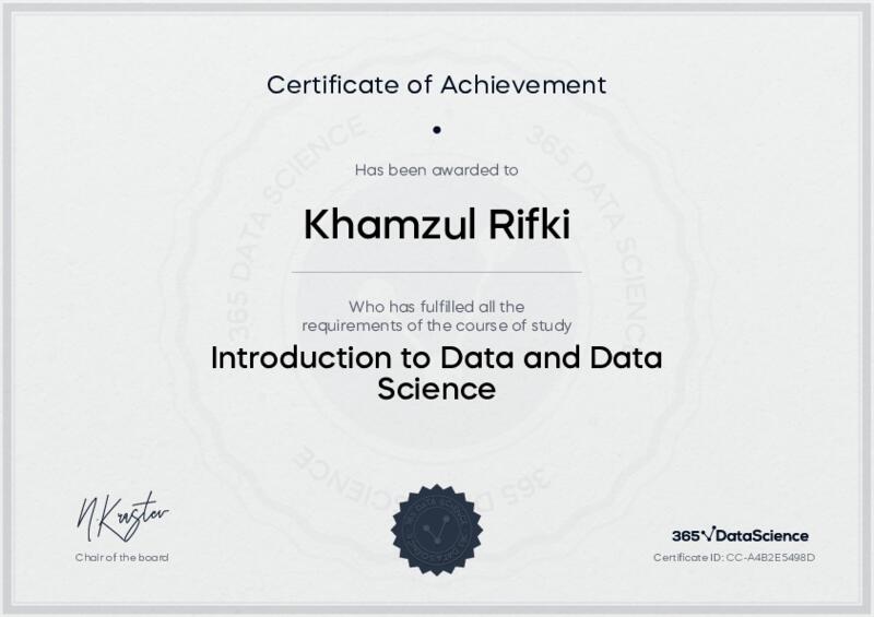This user has been awarded the Introduction to Data and Data Science Certificate for successfully completing the course exam. Holding this certificate demonstrates their proficiency on the topic and signifies they are qualified to apply their newly acquired expertise in the fields of data analytics and data science.