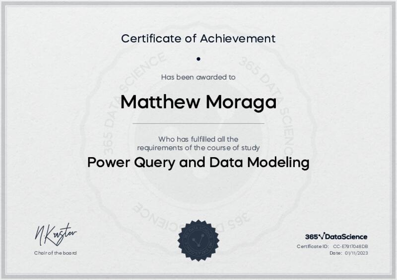 This user has been awarded the Power Query and Data Modeling Certificate for successfully completing the course exam. Holding this certificate demonstrates their proficiency on the topic and signifies they are qualified to apply their newly acquired expertise in the fields of data analytics and data science.