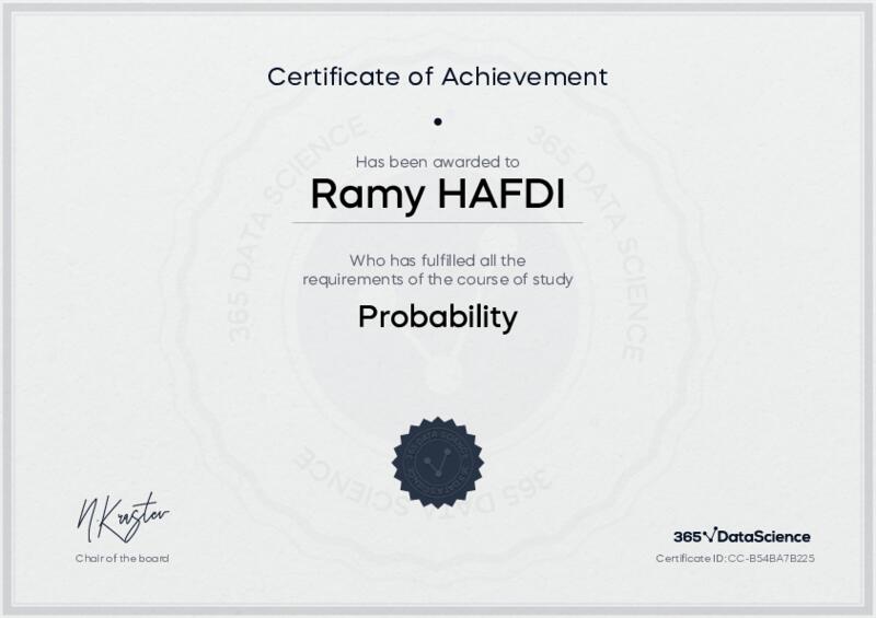 This user has been awarded the Probability Certificate for successfully completing the course exam. Holding this certificate demonstrates their proficiency on the topic and signifies they are qualified to apply their newly acquired expertise in the fields of data analytics and data science.