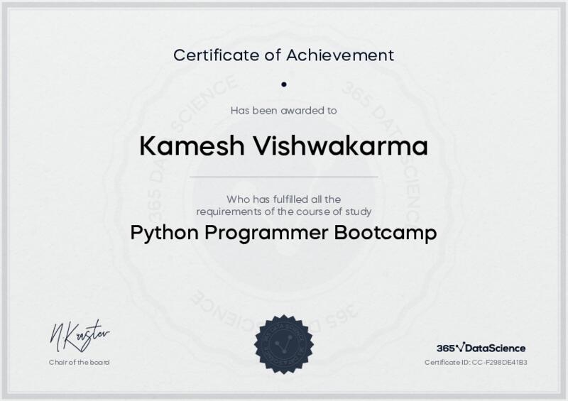 This user has been awarded the Python Programmer Bootcamp Certificate for successfully completing the course exam. Holding this certificate demonstrates their proficiency on the topic and signifies they are qualified to apply their newly acquired expertise in the fields of data analytics and data science.