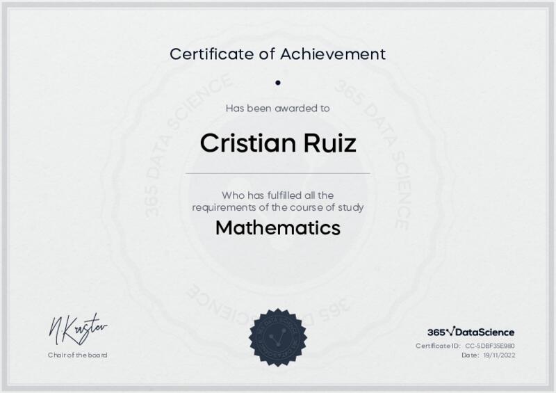 This user has been awarded the Mathematics Certificate for successfully completing the course exam. Holding this certificate demonstrates their proficiency on the topic and signifies they are qualified to apply their newly acquired expertise in the fields of data analytics and data science.