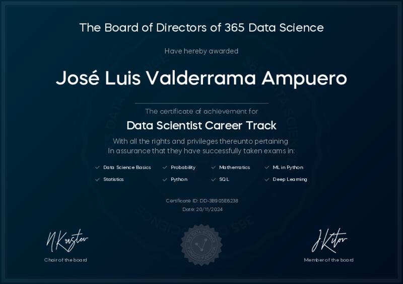 This user has been awarded the Data Scientist Career Track Certificate for successfully completing all courses and assessments. This certificate confirms their technical expertise and professional credibility to work as a data scientist.
