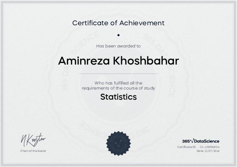 This user has been awarded the Statistics Certificate for successfully completing the course exam. Holding this certificate demonstrates their proficiency on the topic and signifies they are qualified to apply their newly acquired expertise in the fields of data analytics and data science.