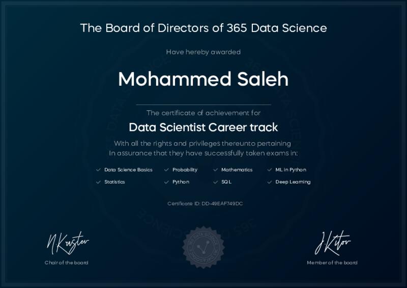 This user has been awarded the Data Scientist Career Track Certificate for successfully completing all courses and assessments. This certificate confirms their technical expertise and professional credibility to work as a data scientist.