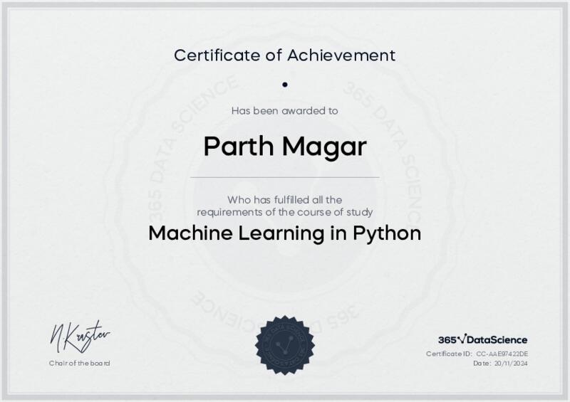 This user has been awarded the Machine Learning in Python Certificate for successfully completing the course exam. Holding this certificate demonstrates their proficiency on the topic and signifies they are qualified to apply their newly acquired expertise in the fields of data analytics and data science.