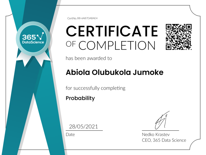 Congratulations! You have been awarded the 365 Data Science Certificate for successfully completing this course. Holding this certificate demonstrates your proficiency on the topic and your ability to apply your newly acquired expertise in the fields of data analytics and data science with confidence.