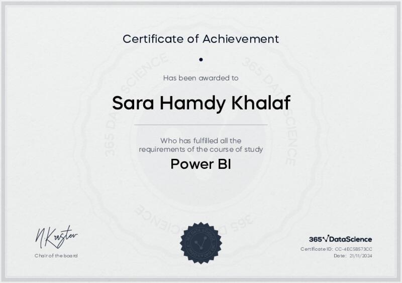 This user has been awarded the Power BI Certificate for successfully completing the course exam. Holding this certificate demonstrates their proficiency on the topic and signifies they are qualified to apply their newly acquired expertise in the fields of data analytics and data science.
