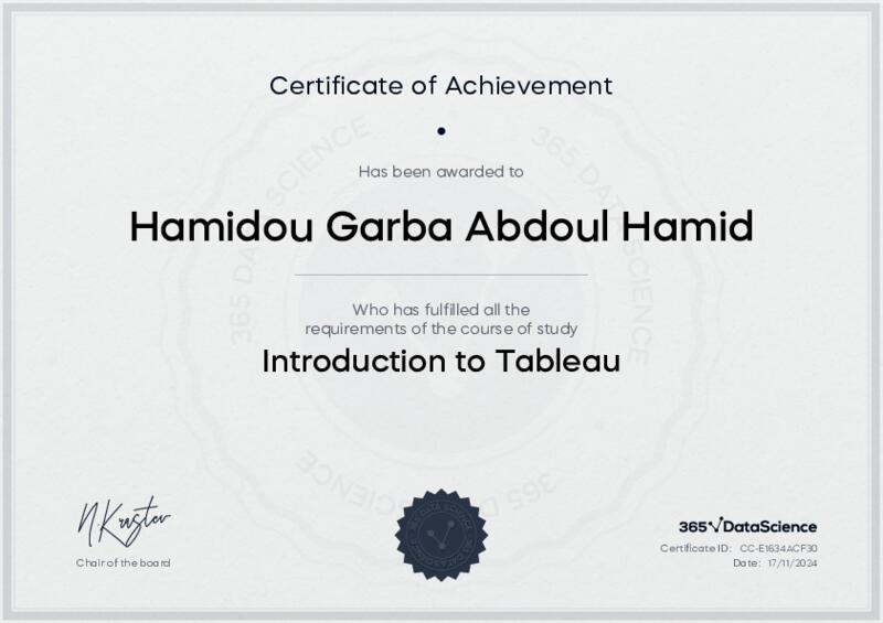This user has been awarded the Introduction to Tableau Certificate for successfully completing the course exam. Holding this certificate demonstrates their proficiency on the topic and signifies they are qualified to apply their newly acquired expertise in the fields of data analytics and data science.